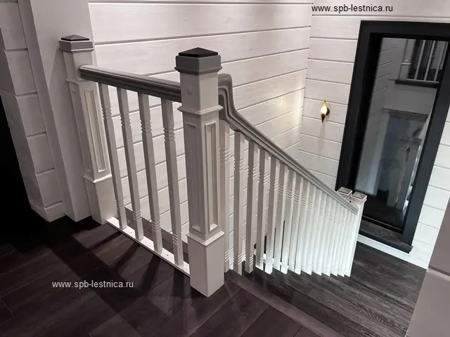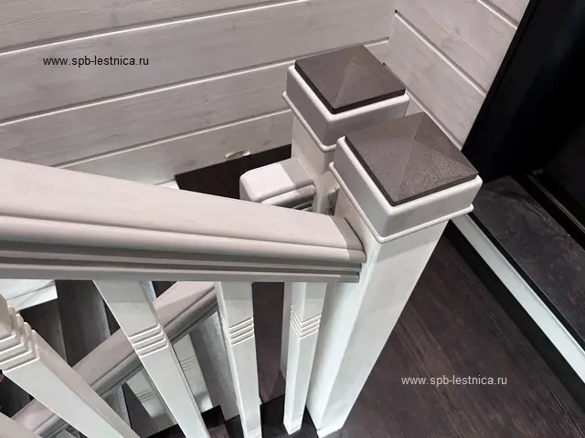 - начальные столбы из массива дуба с декоративными накладками в виде молдингов с каленюрами и фасками; крышки на столбы с навершием в виде "пирамидка";