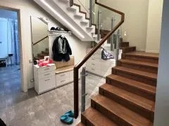 Бетонная лестница с 15 ступенями и площадкой облицована деревом (из цельноламельного щита) буком (ступени, площадка, подступенки, перила и столбы). В пристенный поручень и ступени врезана подсветка (лейд лента).