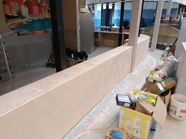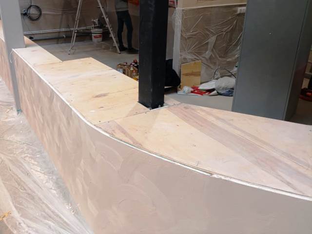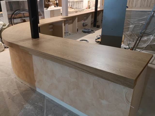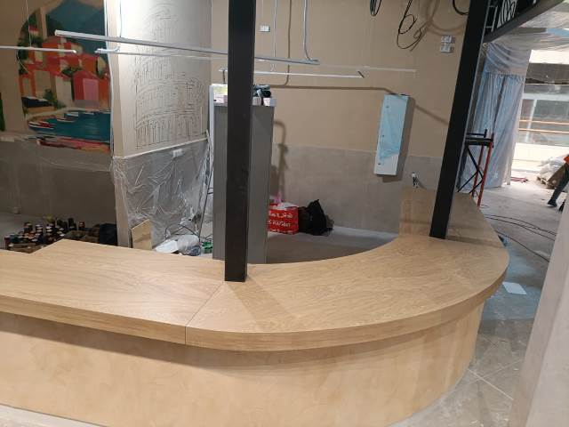 Фигурная крышка для барной стойки кафе сделана из нескольких частей. Заказ выполнен по дизайн проекту » » » с указанными в нем размерами и углом поворота. Столешница делалась по снятым шаблонана с уже сделанной полукруглой радиусной с выступами барной стойки