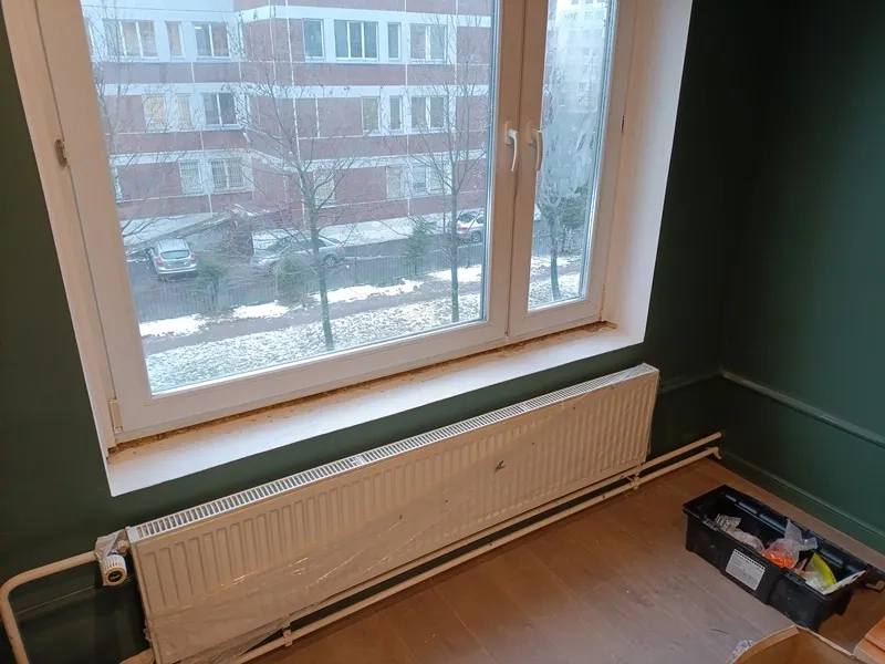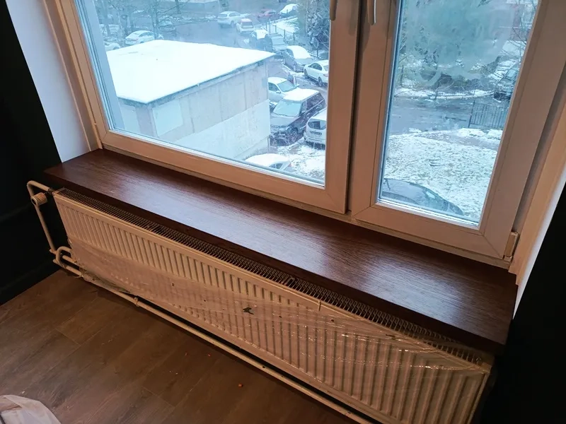Установка деревянного подоконника на пластиковые окна в квартире из шпонированного МДФ и фанеры.
