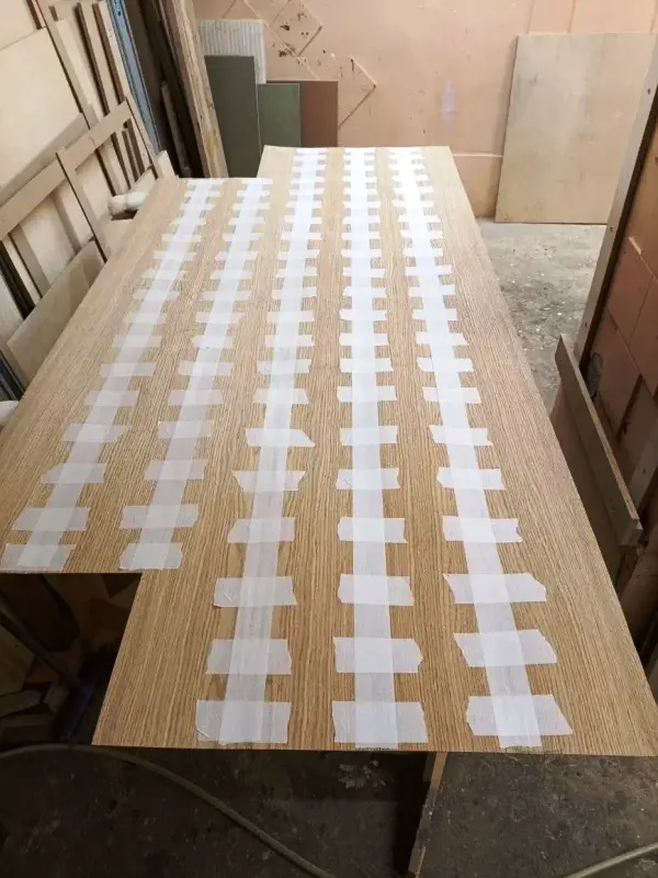 Затем набирается (рубашка) из листов палубы - шпона, по размеру листы, подгоняются по рисунку - структуре дерева. Палуба-шпон бывает с тангес и радиал (смотрите ниже ссылку на описание и фото). Затем поверхность фанеры (МДФ) промазывается клеем (пур, ПВА ...) для дерева, палуба/шпон между собой проклеивается временно бумажным скотчем (чтоб по швам-стыкам не разъехалась-сдвинулась-сместилась листы палубы-шпона).