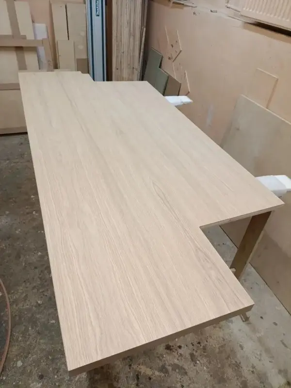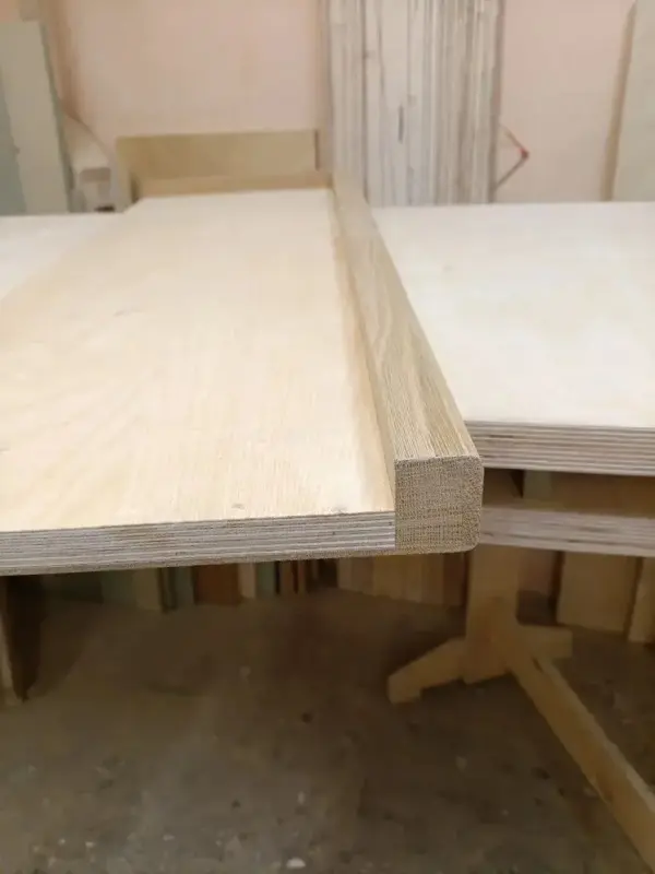 Толщина фанеры зависит от нужной толщины изделия (подоконника, столешницы, каминной полки и т.д.). Мы обычно работаем с 12-24 мм толщиной, при необходимости снизу доклеиваем еще слой фанеры до нужной толщины. Например нужен подоконник толщиной 36 мм, мы делаем из 18 мм и 18 мм доклеиваем. Или сначала устанавливаем первый лист и потом на него уже устанавливаем на клей уже шпонированный.