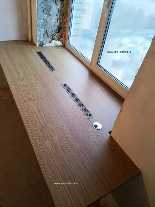 Стоимость этого подоконника с декоративной решеткой и встроенной розеткой, с установкой, 38 000 рублей/м2 (цена 2026 года). Материал: фанера влагостойкая 35 мм + палуба дуба 1,5 мм + покраска бесцветным маслом с твердым воском фирмы бормо (Bormo италия).