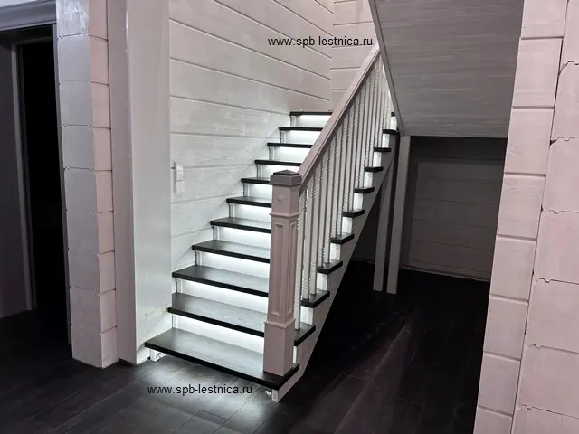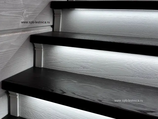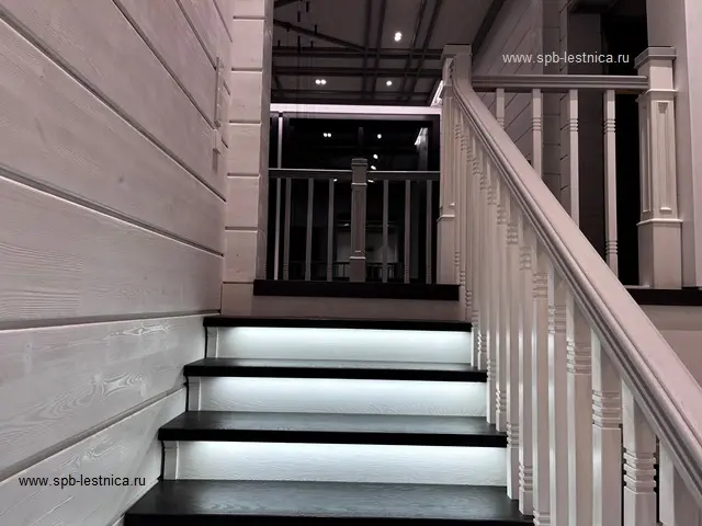 Дизайнерская лестница из дерева дуб: гнутый поручень, подсветка, брашированная.