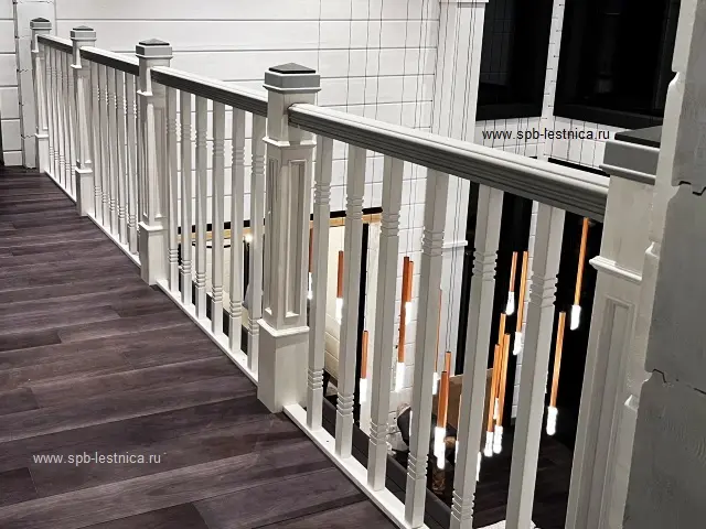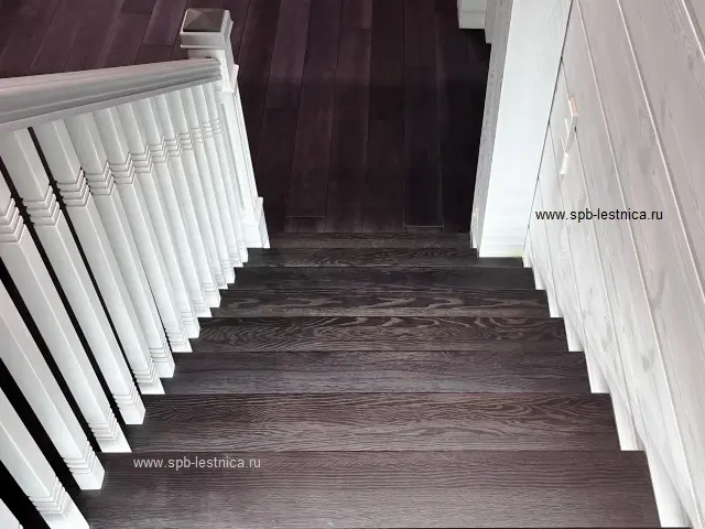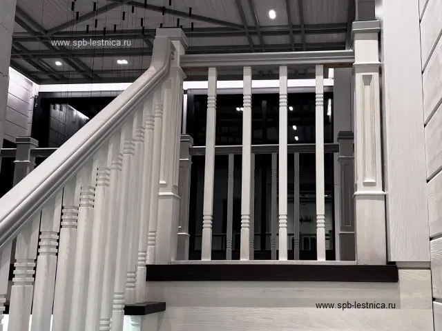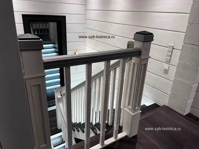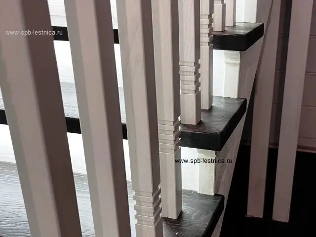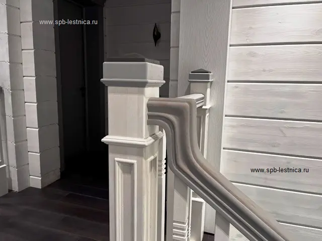 - начальные столбы из массива дуба с декоративными накладками в виде молдингов с каленюрами и фасками; крышки на столбы с навершием в виде "пирамидка";