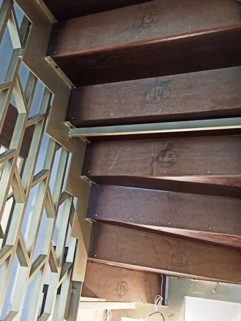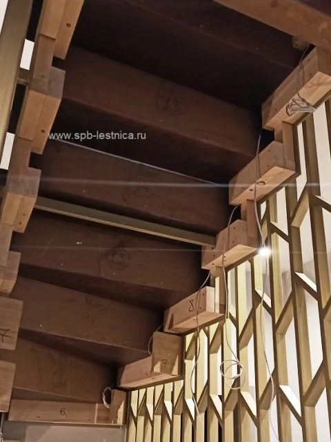 На втором марше (смотрите подробные фото) мы прикрутили деревянные бруски. Так как там не было уголков для крепления. Да бывает и так. И эти бруски стали "опорными", к которым потом прикручивали ступени. И эти бруски стали как направляющие для последующей зашивки низа лестницы мебельным щитом.