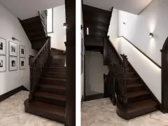 Мы производим лестницы на второй этаж частного дома из разных пород дерева (сосна, бук, дуб, лиственица, береза, ясень), так же делаем комбинированные и отделку/обшивку/облицовку бетонных и металлических с различными видами и типами ограждений и перил.