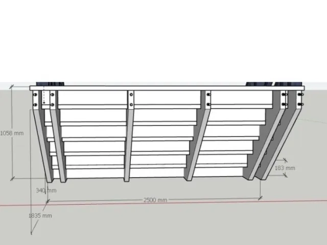 Косоуры несущие 6 штук из фанеры влагостойкой 35 мм, ступени и подступени 7 штук, ограждение продольные планки по индивидуальному дизайну.