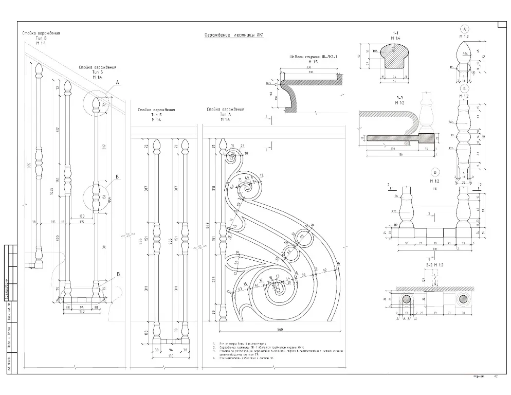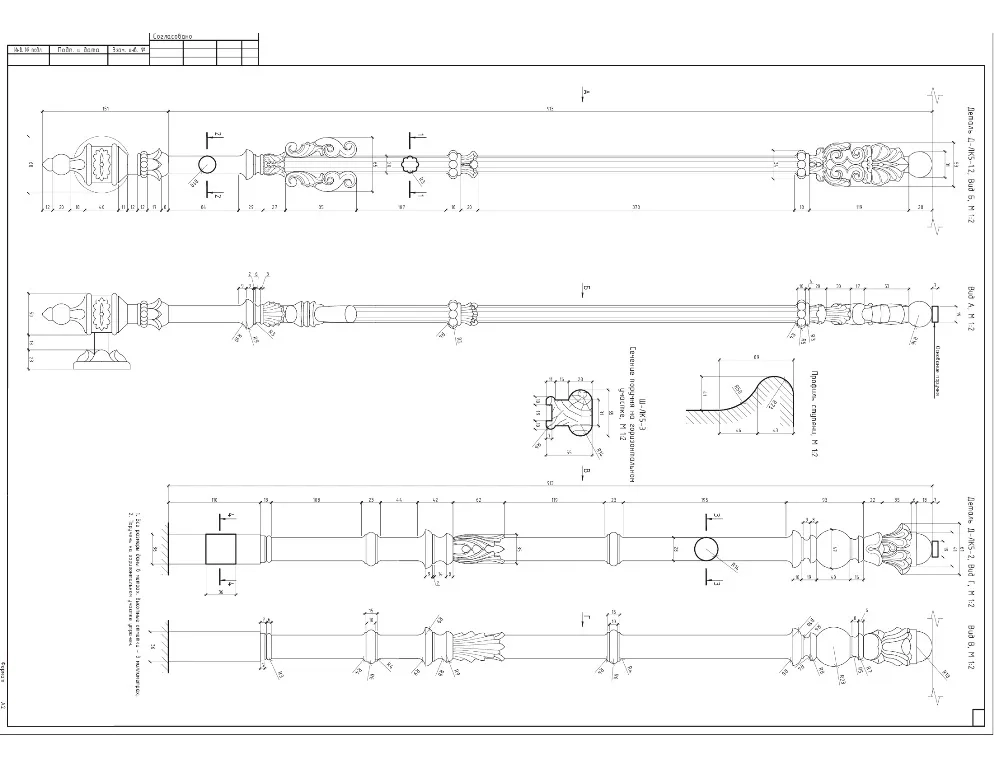 Это техническое задание из комплектов чертежей, прислал нам для оценки стоимости изготовления различного профиля деревянных поручней, на металлическое ограждение в старинном здании.