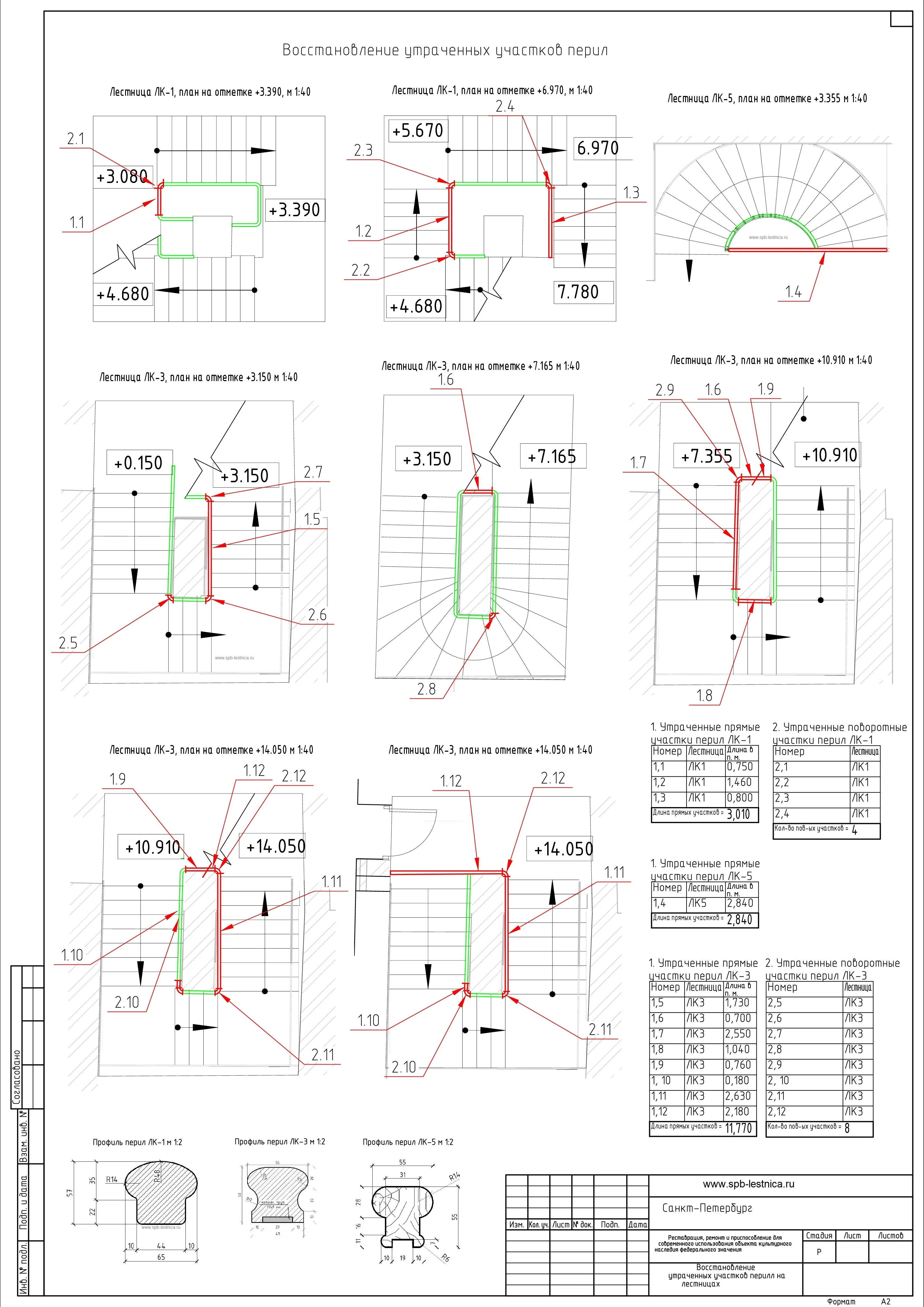 Сама лестница находится в здании старинной постройки в котором идут рестиаврационно-ремонтные работы города Санкт-Петербурга. По техническому заданию нужно частично отремонтировать и сделать некоторые новые элементы перил определенной конфигурации.