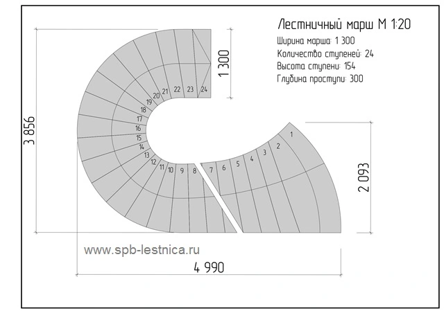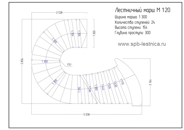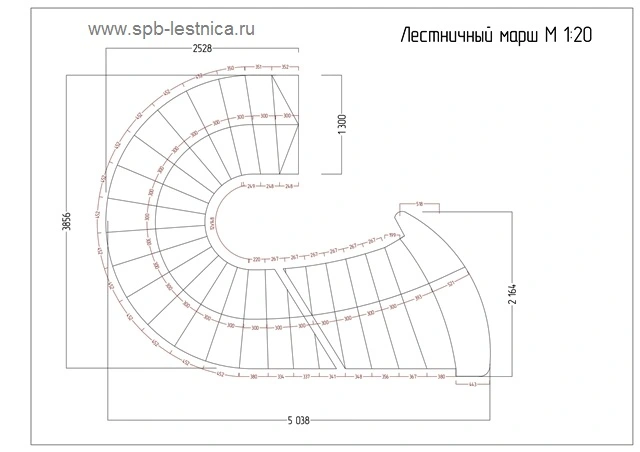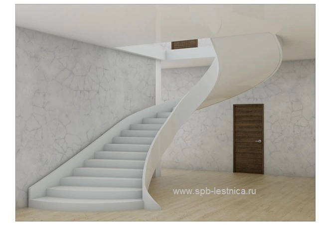 На странице мы разместили вариант проекта изогнутой полукруглой винтовой лестницы из монолитного бетона с разворотом на 180 градусов. Ступени забежные разные по длине и ширине, первая ступень пригласительная радиусная. Ширина марша начинается с 1 ступени чуть более 2 000 мм (2 м) и последняя ступенька на 2 этаже уже 1 300 мм (1,3 м).