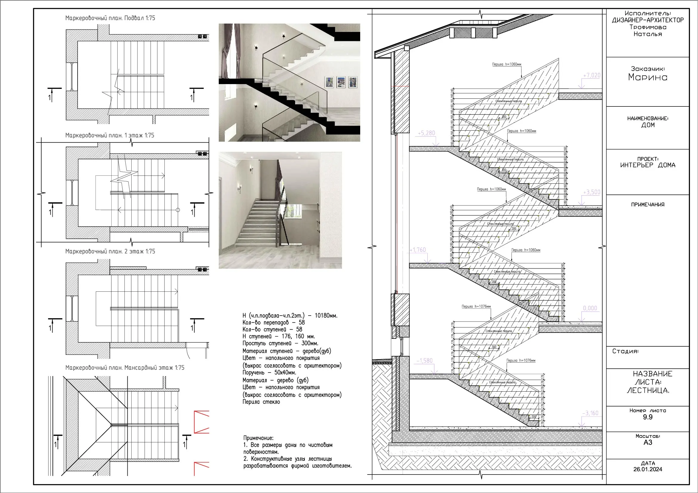Эти чертежи 3 бетонных лестниц на четыре этажа частного дома с мансардным и цокольным этажем, присланы нам для рассчета стоимости облицовки (ступеней, подступеней, площадок) деревом.
