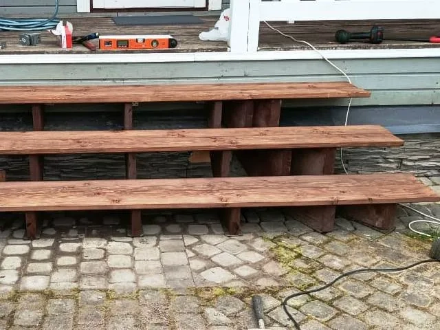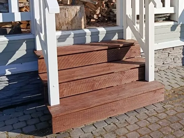 Смотрится необычно, а самое главное удобно. Технические характеристики: ступени и подступени из террасной доски лиственница "вильвет" покрашенные маслом для террас фирмы тиккурила. Ступени стоят на косоурах из влагостойкой фанеры 50 мм толщиной.