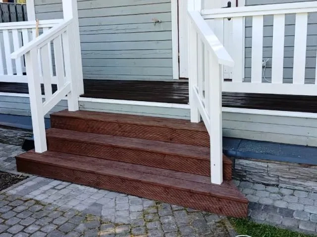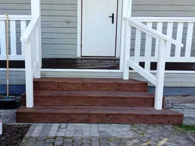Ограждение сделано из сухой строганой доски с вертикалными балясинами из планкета 20*120 и со столбами из сращенного клееного бруса 80*80, все из сосны. Покраска сделана краской для наружных фасадных работ "винха" (точнее септик).
