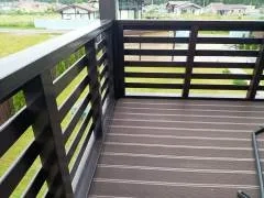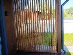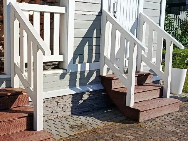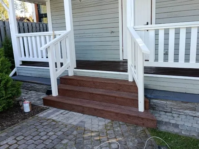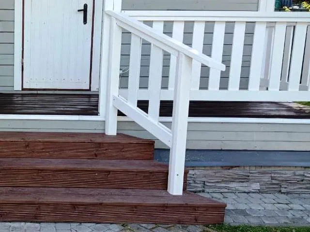 Техническое решение: столбы деревянные клееные 80х800х1100 мм, вертикалные рейки из планкена 20х90 мм, перила из сухой доски 40х70 мм. Покраска сделана антисептиком укрывным фасадным для деревянных поверхностей "винха" фирмы тиккурила.