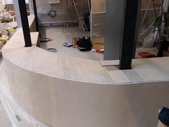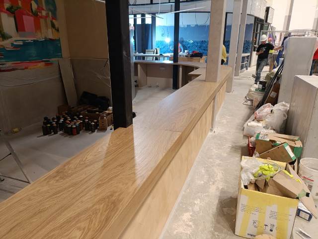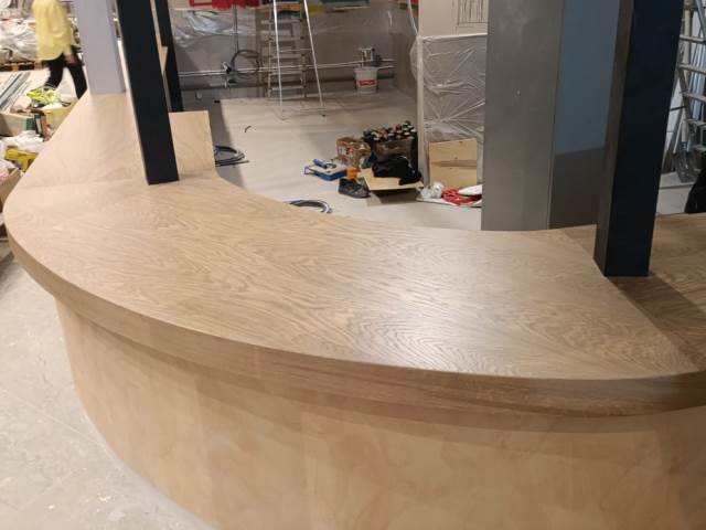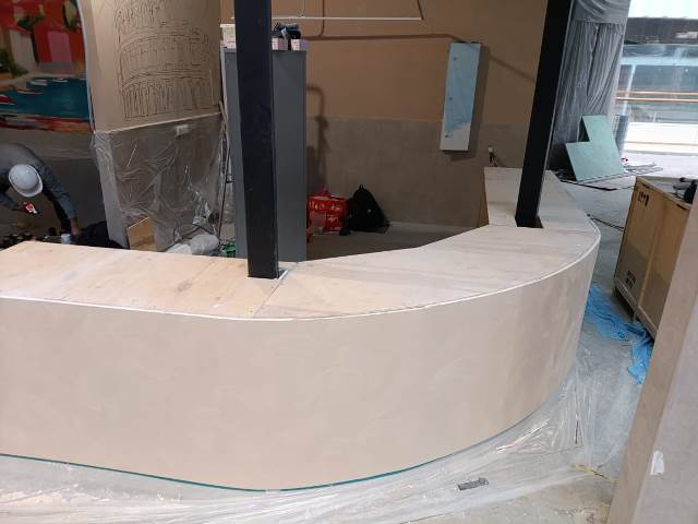 Фигурная крышка для барной стойки кафе сделана из нескольких частей. Заказ выполнен по дизайн проекту » » » с указанными в нем размерами и углом поворота. Столешница делалась по снятым шаблонана с уже сделанной полукруглой радиусной с выступами барной стойки