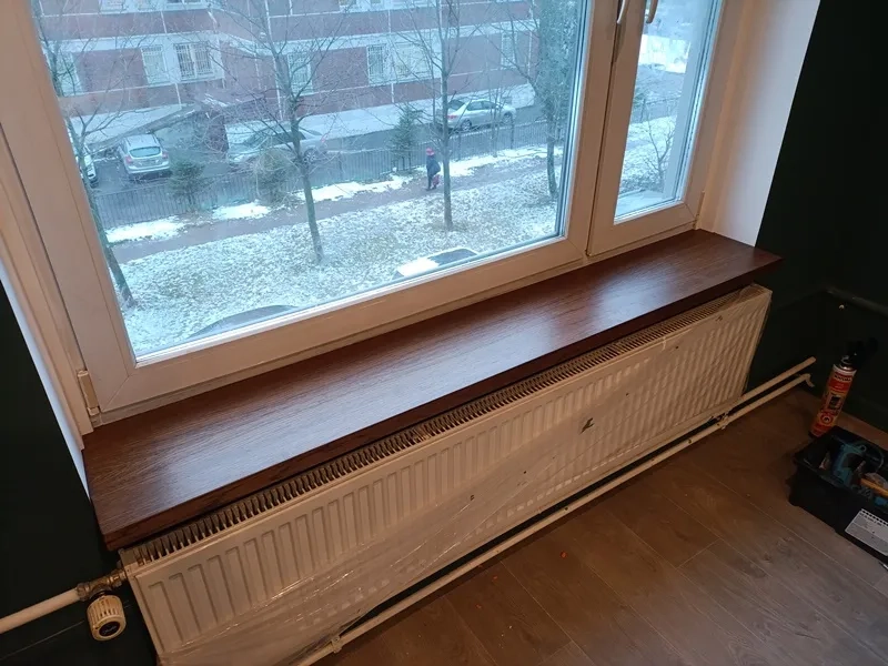 Установка деревянного подоконника на пластиковые окна в квартире из шпонированного МДФ и фанеры.